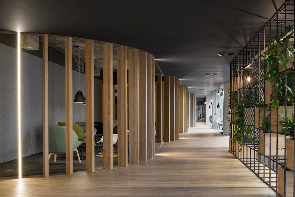 Tags:科技公司,沉穩(wěn)暗色調、橡木與灰色、曲線、城市道路肌理、“街道”主動線、中央集會空間、橡木隔斷、螺紋鋼筋裝飾架、工業(yè)風
