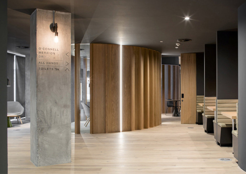 室內的主動線被設想成典型的都柏林街道,蜿蜒流動。這條“街道”是一個充滿活力的信息分享公共空間。沿著這條主動線,是星羅棋布的分支路線由路標指向會議室、社交區(qū)和工作區(qū)等。這些路線均按都柏林真實的道路名來命名。所有的道路最終匯聚在位于中心的全體集會空間,同時這里也是與全球其它辦事處聯(lián)動舉辦重要發(fā)布的活動現(xiàn)場。